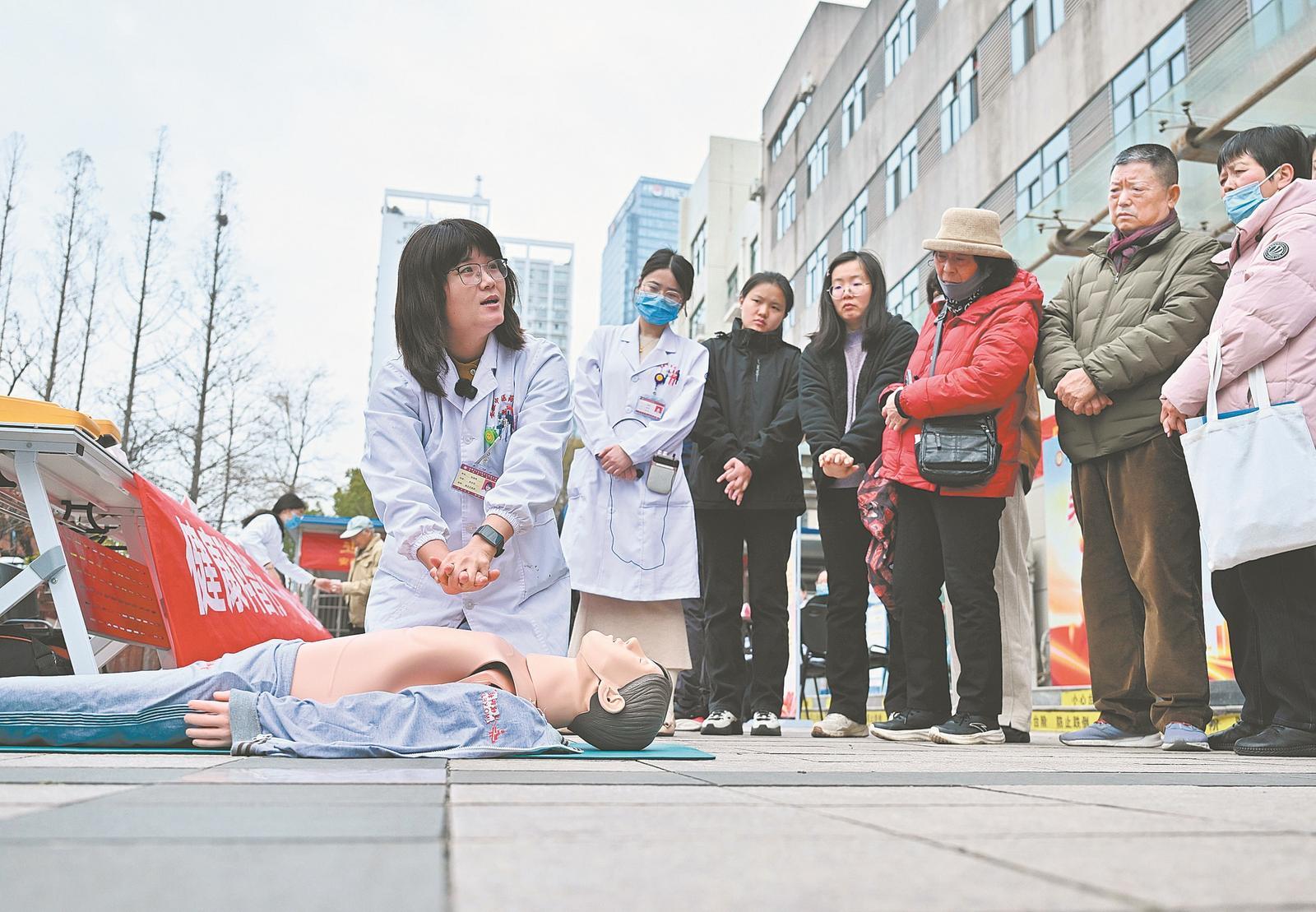 近日,在安徽中医药大学第二附属医院(安徽省针灸医院)“关注急性心梗筑牢生命防线”义诊活动现场,医生开展心肺复苏现场教学。(程兆 摄)