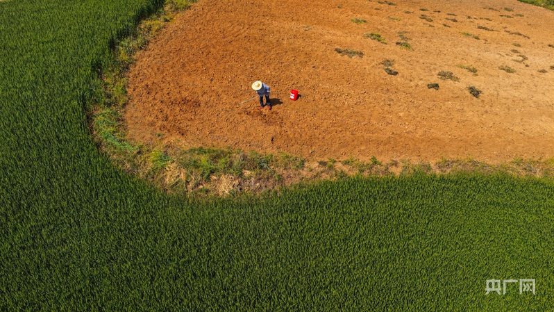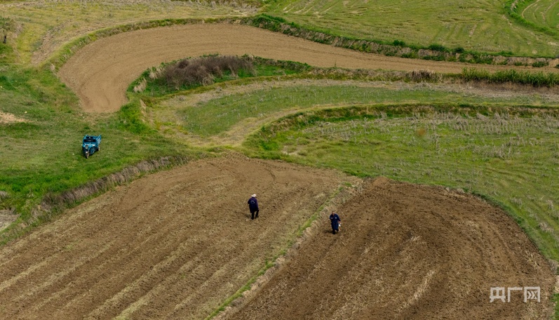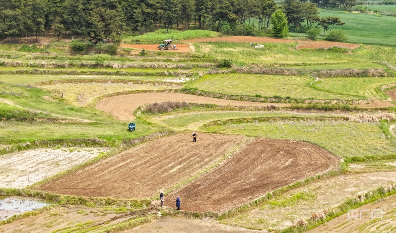 4月19日,安徽省蚌埠市五河县小溪镇霍庄村农民在平整秧田(央广网发 李向前无人机照片)