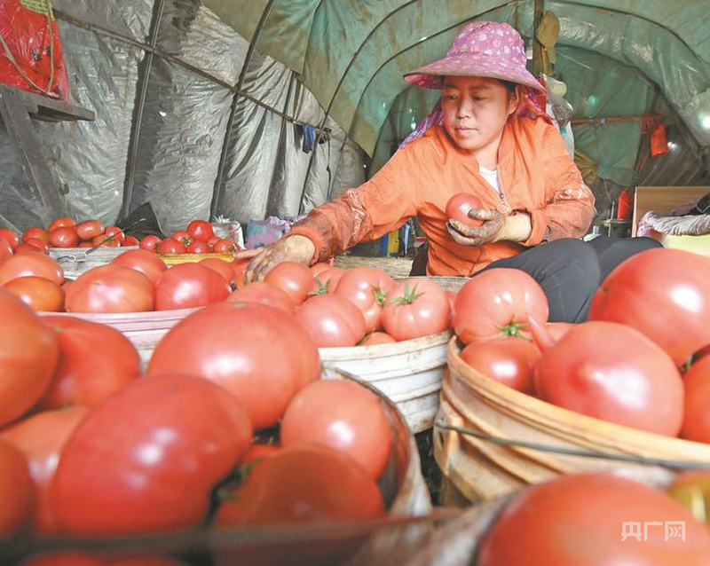 果农们手法娴熟地对刚采摘的番茄进行摆放(央广网发 马丰成摄)