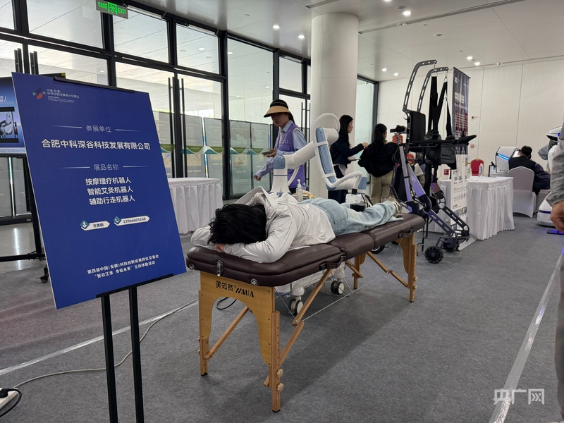 参观者现场体验按摩理疗机器人(央广网记者 鲍玉婵摄)