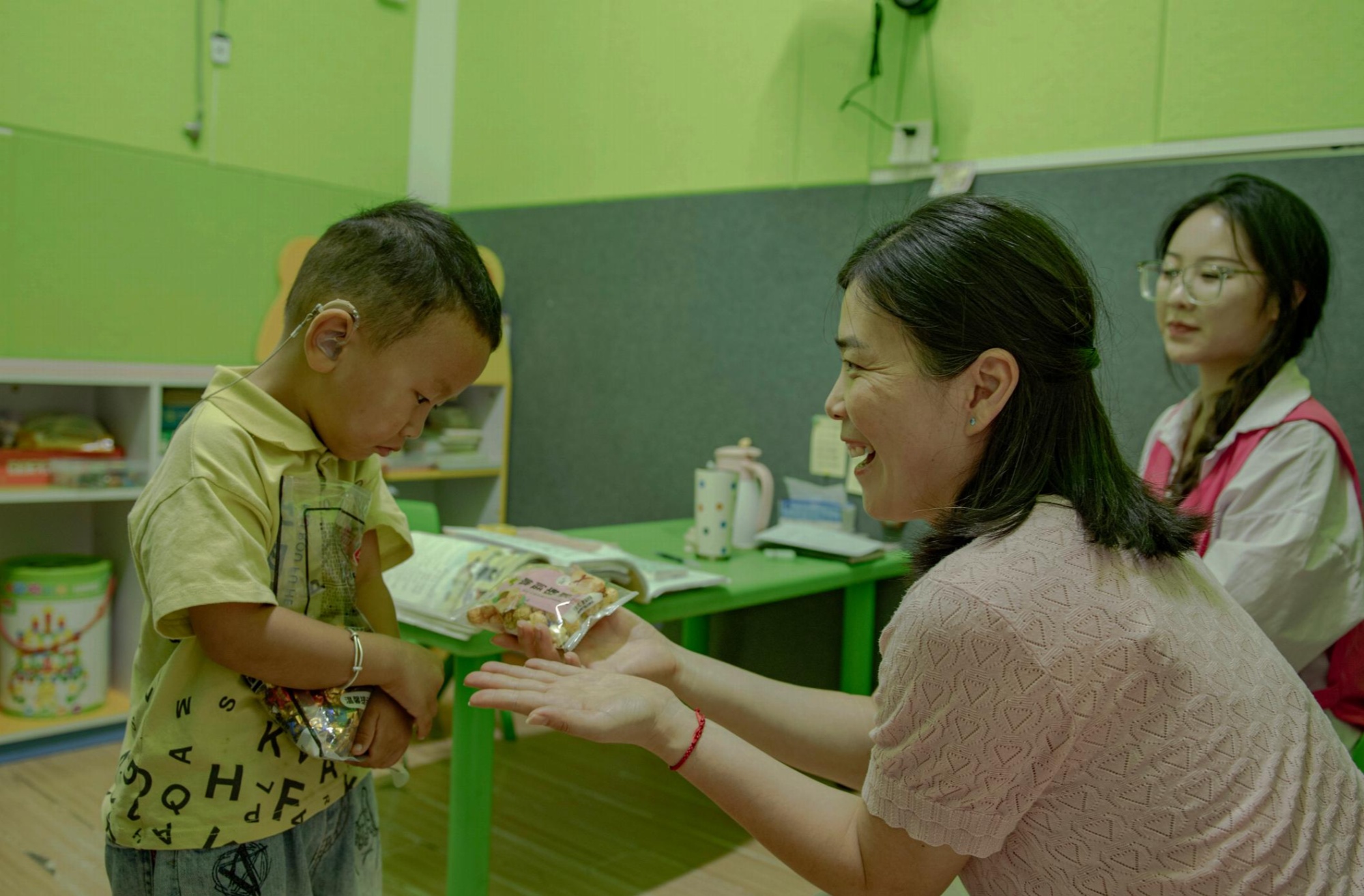 程海燕从事残障儿童康复工作已有15年,现任合肥市瑶海区笑童颜康复中心园长。她是残障儿童的守护人,在教学工作中,苦心钻研、大胆创新,牵头成立康复研究专班,历时7年编写康复教材11本,让康复过程更加科学化、系统化、规范化,先后促进400余名听障儿童、500余名孤独症儿童康复。图为合肥好人程海燕在辅导小朋友识别食物。(刘传耀 摄)