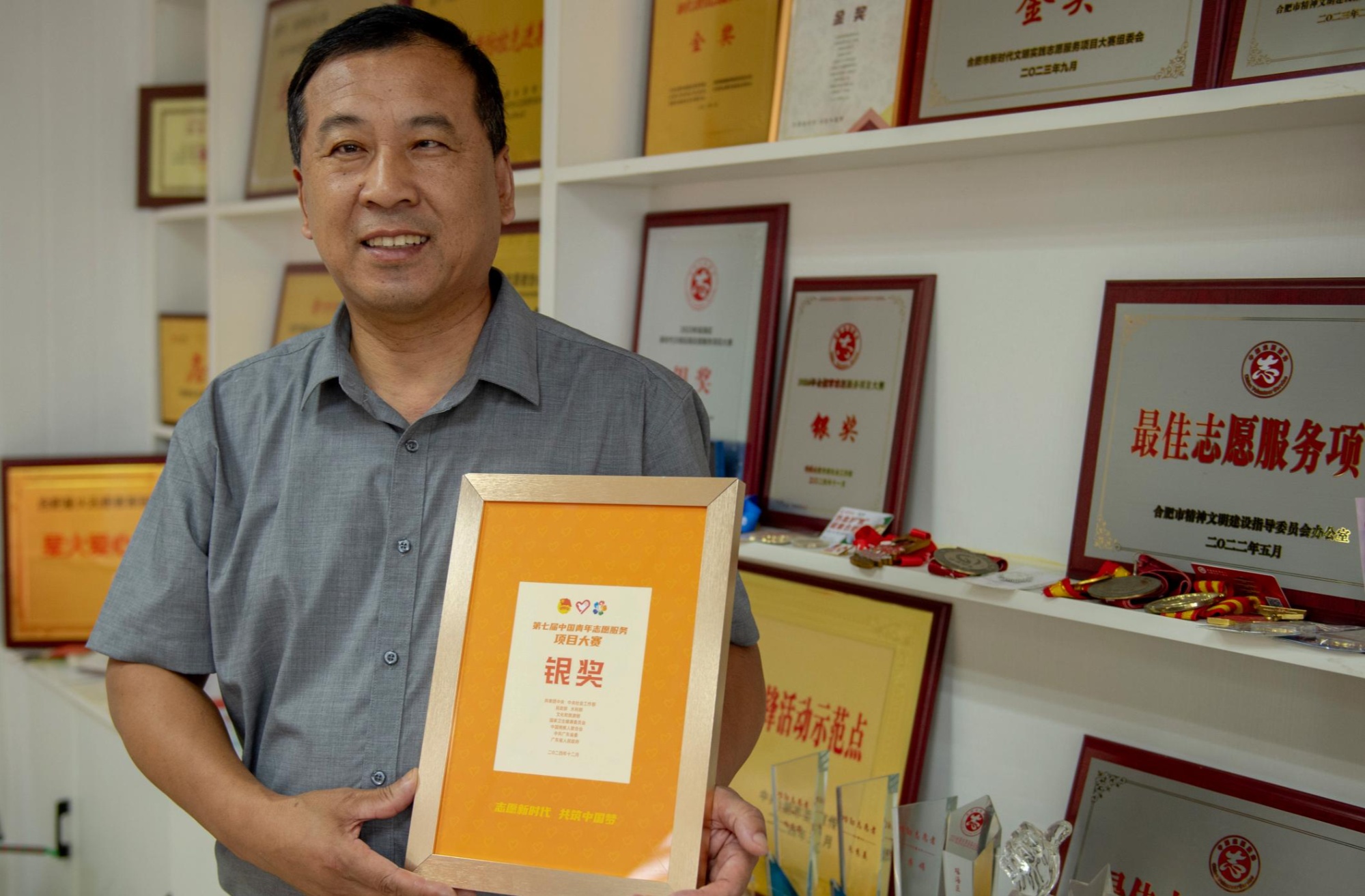武金刚创办的瑶海区星火社会公益创新发展中心,在常态化开展文明实践志愿服务活动的基础上,培育实施了“暖流”三献、“有爱无碍”等多个优秀志愿服务项目。他个人累计志愿服务时长15000小时、捐赠6万余元,募集捐赠社会爱心物资价值约200万元。图为武金刚获得第七届中国青年志愿服务项目大赛银奖。(刘传耀 摄)
