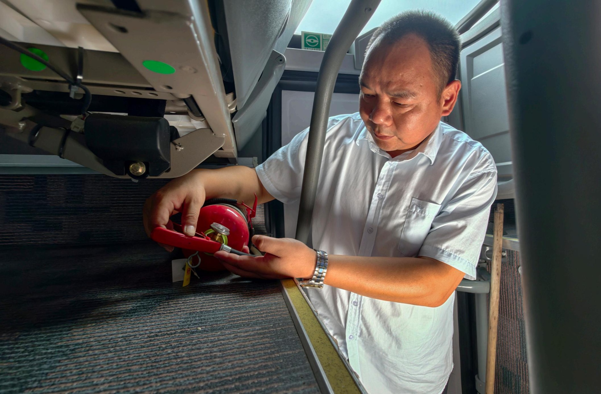 夏力立足平凡岗位,用心服务乘客,工作近二十年来未发生一起服务投诉和安全事故,安全行车60余万公里;夏力还成立了“力哥志愿服务队”,走进农民工子弟学校捐资助学,连续10年不间断关爱敬老院孤寡老人,参加公益献血。图为夏力出车之前对车辆进行检查。(徐经平 摄)