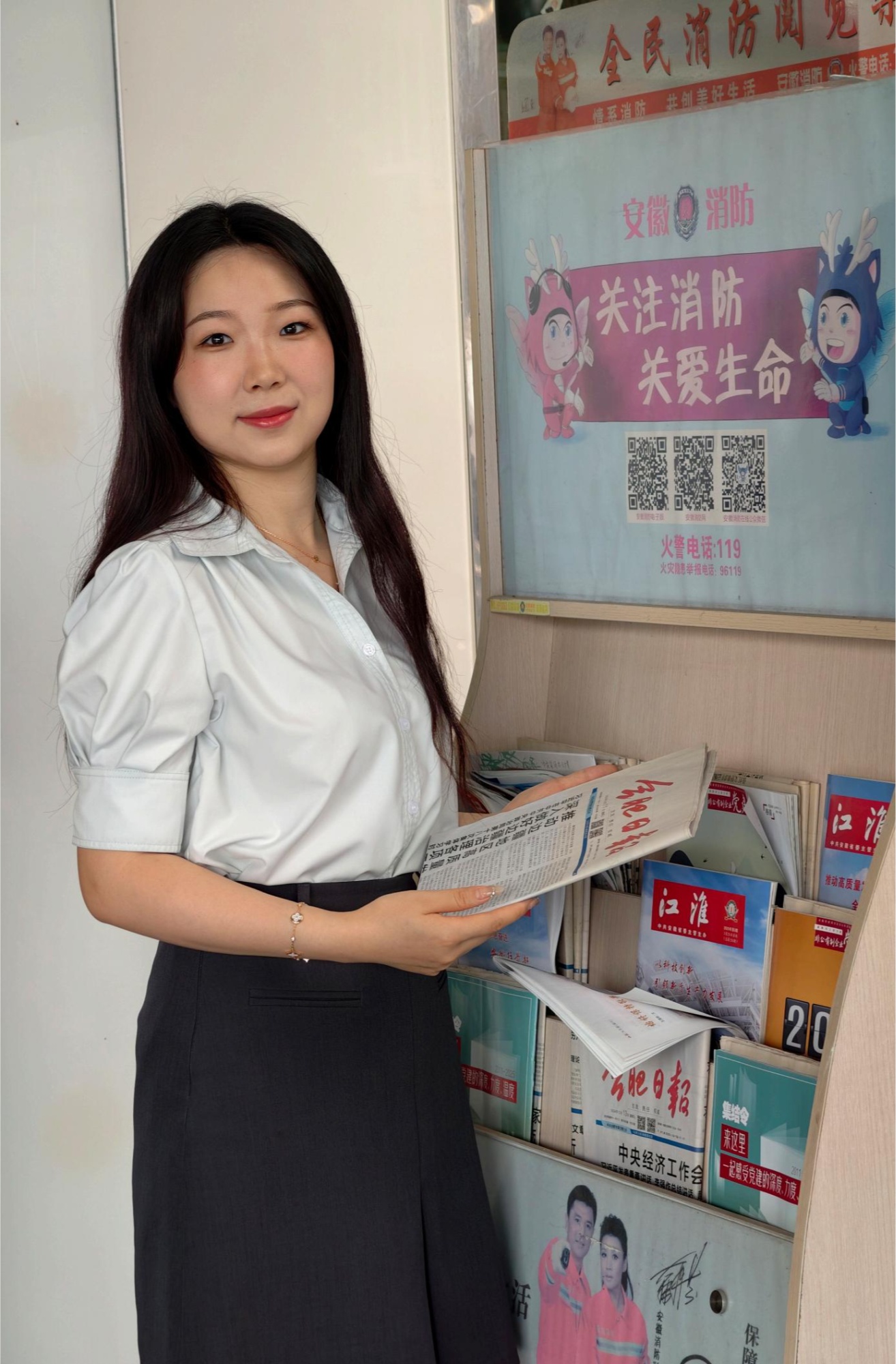 2023年11月15日中午,李杨驾车经过合肥五里墩高架桥上时,一名老人因为迷路驾驶电动轮椅逆行误上高架,在高架上逆行前进,情况十分危险,过往车辆纷纷避让,李杨看到老人情况后,将车停到高架桥下,奋力奔跑上高架桥,拦住逆行的轮椅老人,和随后赶来的交警将老人护送下高架。图为李杨在公司宣传阅览柜前。(刘兵生 摄)