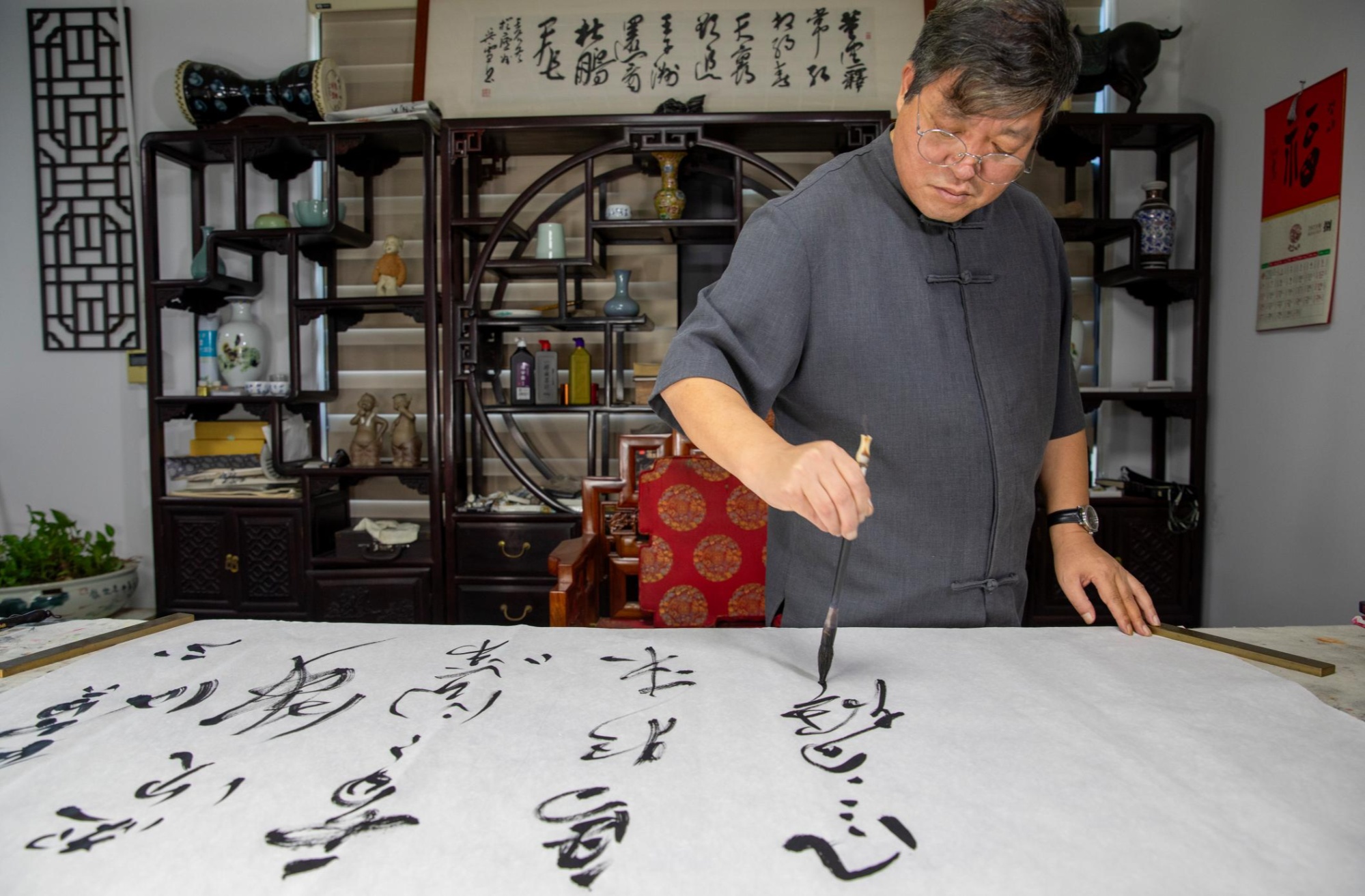 知名画家王子洲,以画鸡闻名,王子洲自幼命运多舛,受助成才后心怀感恩、回报社会,他倾尽毕生心力与财富投身公益,坚持28年卖画助学,受助学生近500名,义务支教山区小学三年。累计捐款2000余万元。先后获得“中国好人”、“全国道德模范提名奖”等荣誉。图为王子洲正在进行书法创作。(宣梅 摄)