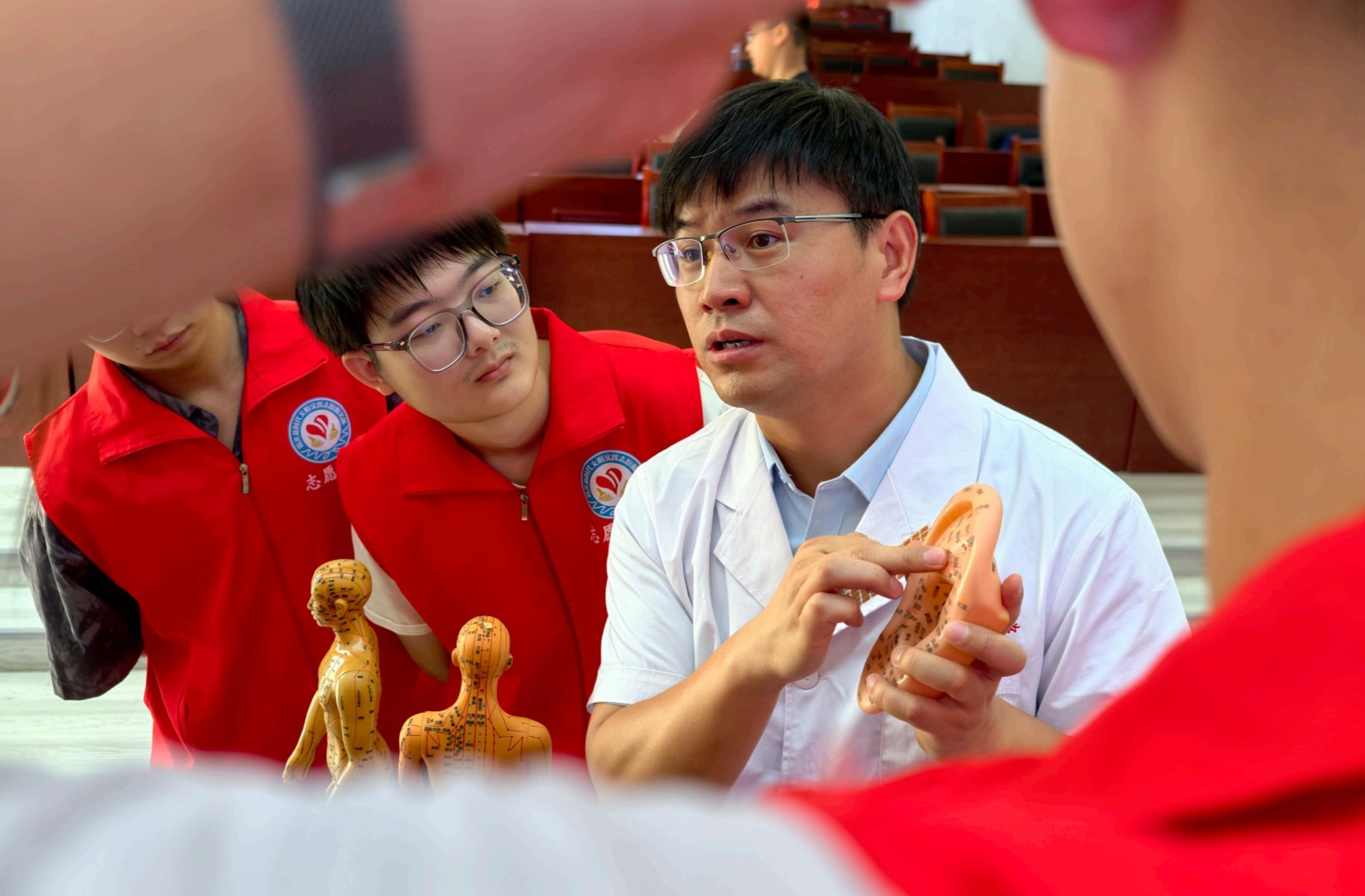 齐亚军立足中医专业,带领学校3000余名志愿者常态化走进社区、工地、敬老院、新时代文明实践中心等地开展中医义诊活动2000余次,19年期间服务时长6000多小时,受益群众超10余万人次,先后10次危急时刻成功救护急症群众。他线上线下开展中医药养生保健知识科普宣讲200余场,11余万人观看,点赞数超330万次。《人民日报》《央视新闻》《中国青年报》等权威媒体报道百余次。曾获评全国最美志愿者、“安徽好人”等荣誉。图为齐亚军给社区大学生志愿者们普及中医知识。(宣梅 摄)