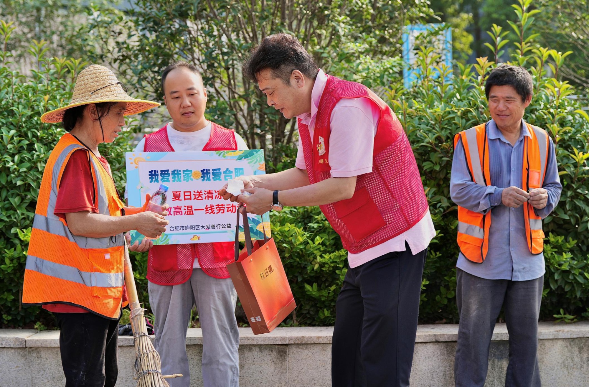 自2013年以来,艾东热心志愿服务于抗洪抢险、疫情防控、扶困助残、敬老助老、文明创建、社区便民服务、爱心护考等活动。累计参加志愿服务时数达8000小时,带领团队开展公益活动300场,十多年来服务近60万群众。图为合肥好人艾东“合”你一起送清凉。(隋滨滨 摄)