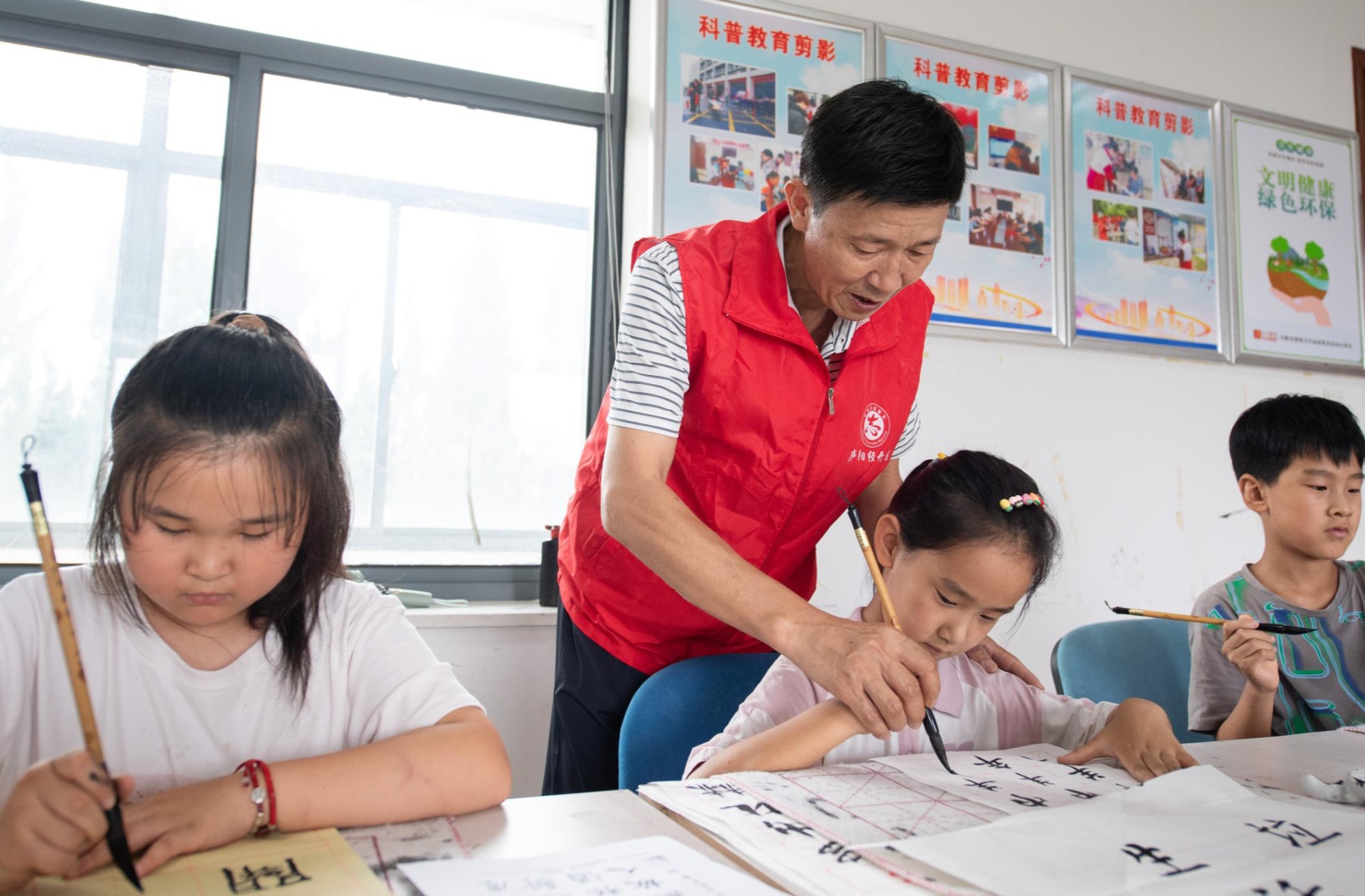 无论在哪里工作,单务民始终坚持为“希望工程”捐款,从未间断对贫困学生的爱心资助。2008年11月,因身体不适,单务民被确诊为左肾癌晚期。在医院,他做了左肾切除手术,并进行化疗。一边治疗一边休息的单务民,联络一些有爱心的朋友,创建了合肥市第一个民间公益QQ群“合肥爱心驿站”。多年来,他筹款200多万,个人捐款近50万元,资助多所学校,帮助近百名农村孩子完成学业。图为单务民在社居委暑假托幼班指导学习书法的孩子们。(骆先洋 摄)
