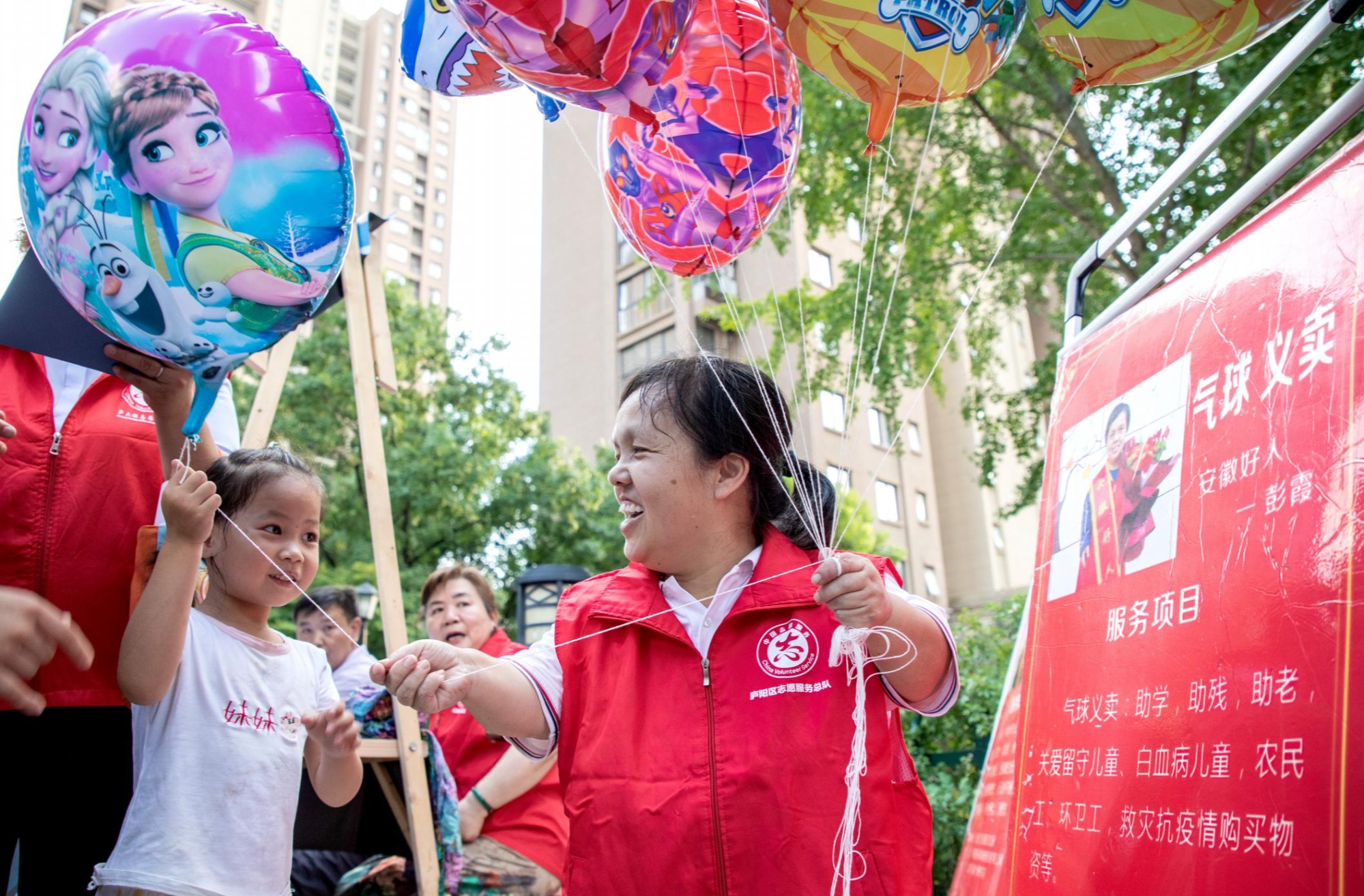 彭霞,合肥市庐阳区个体经营户。她虽然身高只有1.1米,但热心公益10年,志愿服务时长达3000小时。生活中,她乐观向上、乐善好施,因走街串巷卖气球被亲切地称为“气球姐姐”。她不仅组织和参加各类公益志愿服务活动近千场,而且募捐善款和物资数十万元,个人捐款10万多元。此外,彭霞还用自己卖气球所得的微薄收入,资助了60多名贫困学生继续学业,用双手托举起孩子们的求学梦想。图为“中国好人”彭霞参加庐阳区文明实践走进社区便民义卖志愿者活动。(曾菁 摄)