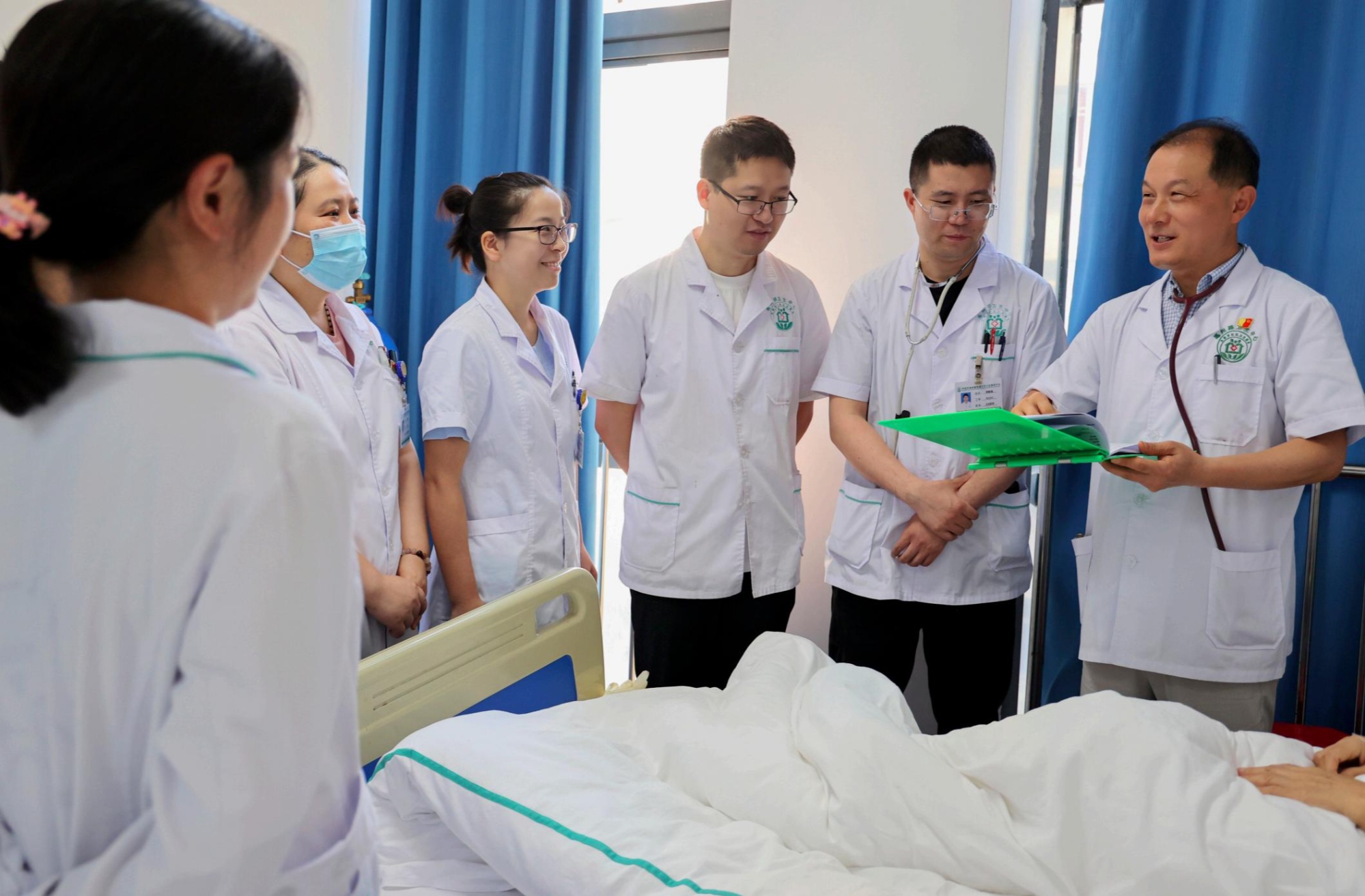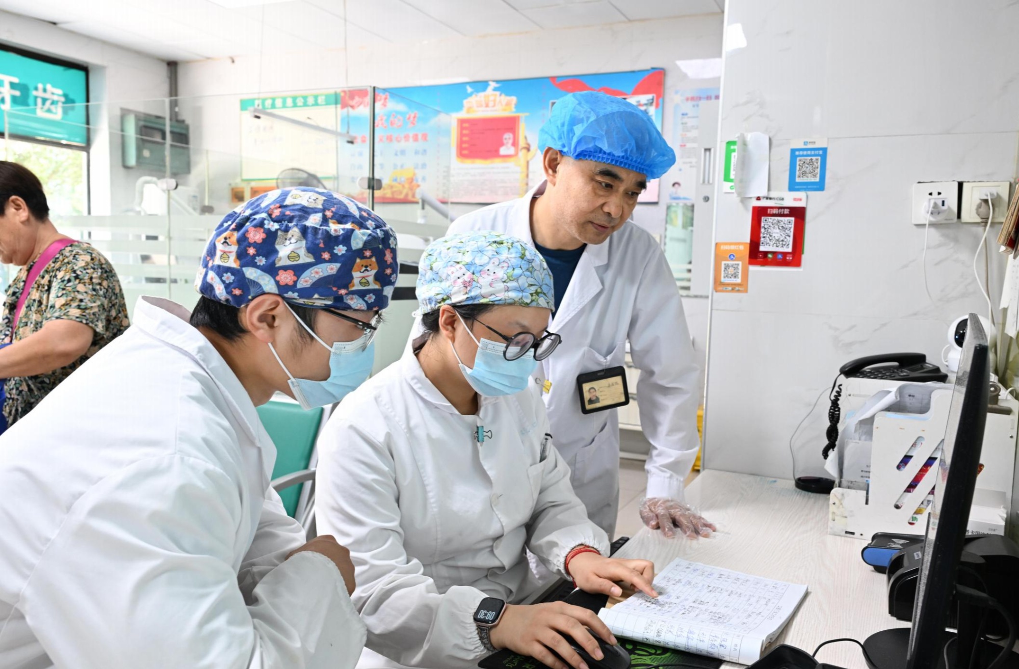 “医者仁心,要做好社区居民的‘健康卫士 ”是杨华一直坚守社区卫生工作的初心。正是这份初心,让他扎根基层卫生工作20多年。自1997年从事社区卫生工作以来,杨华一直坚持“对待病人要有爱心、对待病人的病情要有同情心、让病人有战胜病魔的信心、让病人看病舒心、让病人走出社区更加开心”的信念。杨华所在的亳州路街道社区卫生服务中心覆盖居民8万多人,与杨华签约家庭医生的居民占到了中心签约数的三分之一,超过了3000人。图为杨华医生带领年轻团队,以自身经验为桥,传递医术精髓与医者仁心,让“传帮带”赋能新一代医者成长。(戴云 摄)