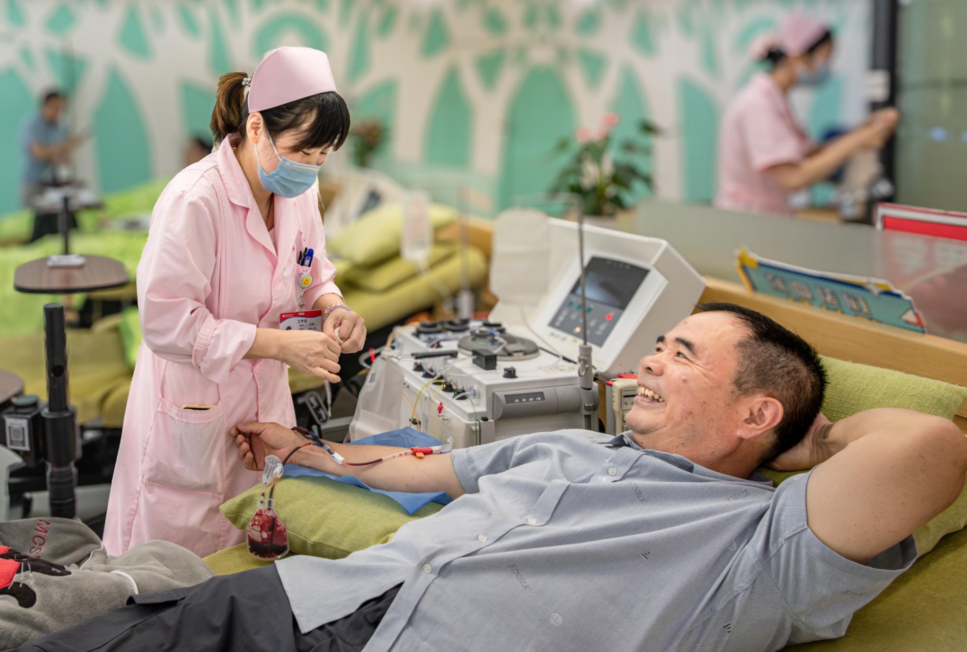 从2007年到2021年,14年时间里,高新公交车658路公交车司机钟诵民累计参加义务献血77次,共献血17400cc,其中献血小板73个治疗量(1个治疗量为200毫升)。钟诵民先后荣获2014-2015年度全国无偿献血奉献奖金奖、2016-2017年度全国无偿献血奉献奖铜奖、2018-2019年度全国无偿献血奉献奖银奖、2020年合肥高新区“高新好人”,同时他还是红十字会遗体器官眼角膜以及中华骨髓库造血干细胞捐献志愿者,他用自己的行动彰显助人为乐的高尚品格。图为正在献血的钟诵民。(张纪宏 摄)