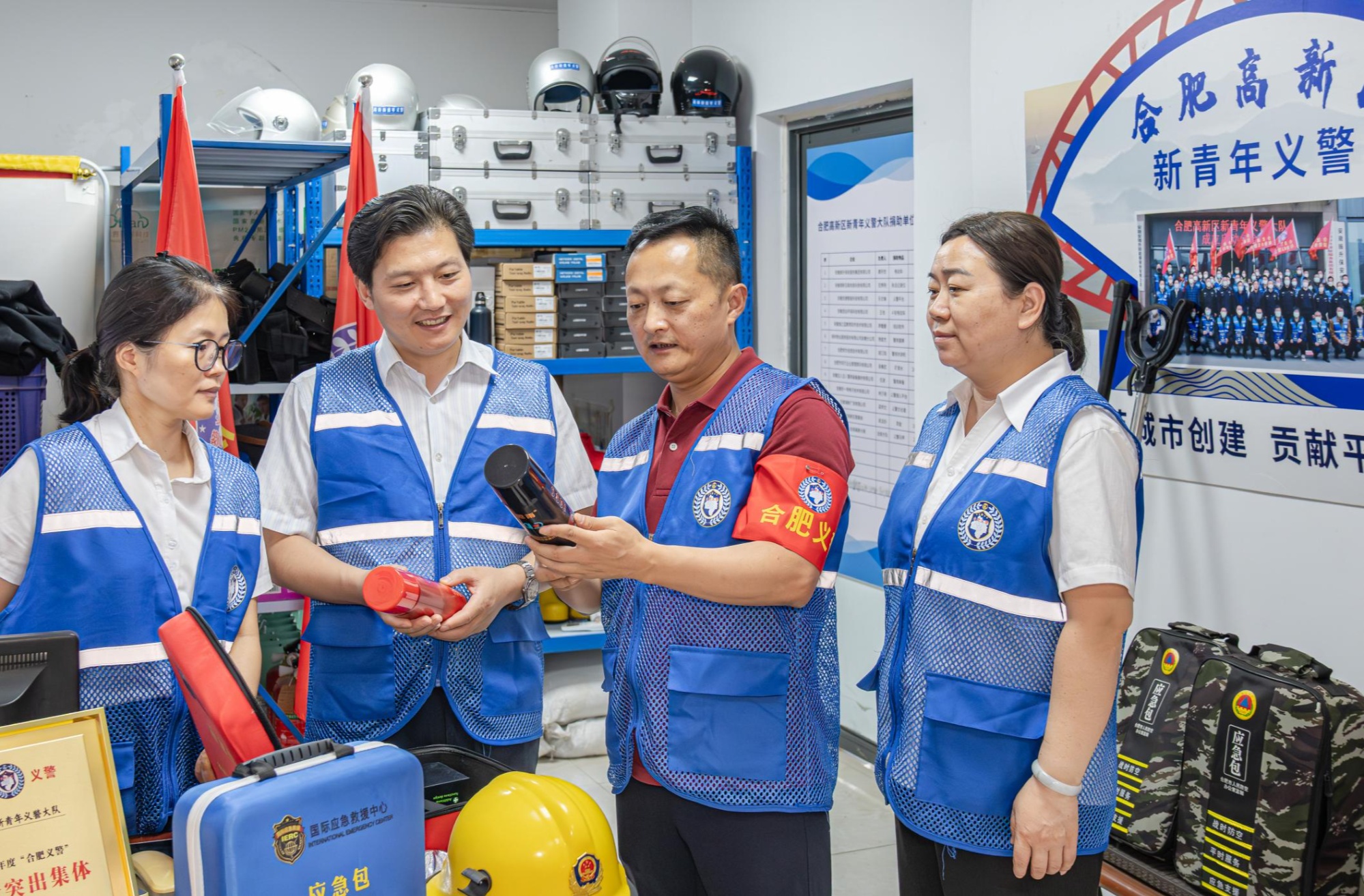 窦开宏同志带领全区青年企业家和“振升铁军”一次次赶往前线,筑牢防疫之墙。为给一线防疫志愿者提供更有力、更充足的物资保障,他多次给一线防疫志愿者送去暖心慰问,并向合肥市红十字会捐赠5万元用于一线防疫。图为窦开宏(左二)正在与义警检查应急包。(徐宁 摄)