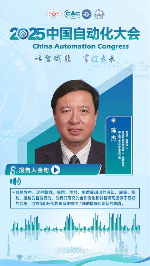10月10日至12日,2025中国自动化大会(CAC2025)在黑龙江省哈尔滨亚冬体育馆召开。在大会报告环节,中国工程院院士,中国自动化学会会士、特聘顾问,哈尔滨工业大学党委书记陈杰将目光投向自然界。他表示,自然界中,蜂群、狼群、羊群、象群展现出的感知、决策、规划、控制的智能行为,为研究的合作演化和群智涌现提供了很好的启发,也为研究物理系统提供了新的借鉴和创新的思路。(来源:中国自动化学会)