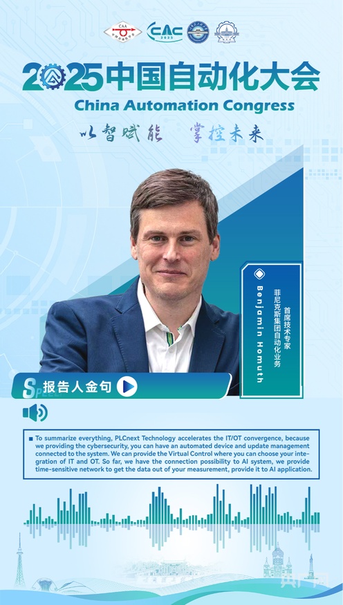 10月10日至12日,2025中国自动化大会(CAC2025)在黑龙江省哈尔滨亚冬体育馆召开。在大会报告环节,菲尼克斯集团自动化业务首席技术专家Benjamin Homuth展示的“PLCnext Technology——新一代开放自动化控制平台”,代表了工业自动化领域的最新发展趋势。他介绍,该平台通过融合IT与OT技术,打破传统控制系统的封闭性,实现硬件与软件的深度解耦。(来源:中国自动化学会)