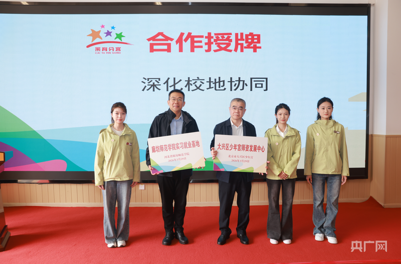 仪式上,北京市少年宫主任牛晓亮与廊坊师范学院副书记崔邦文共同完成合作授牌,标志着京冀两地在师资发展、就业实践、教研协同等方面的合作迈入新阶段。