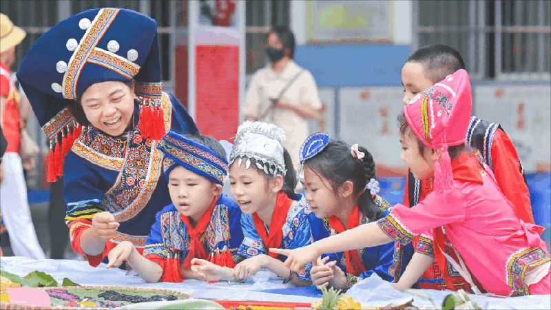 4月21日,壮族“三月三”民俗文化走进广西宁明县第四小学,唱山歌、做美食、穿民族服饰、玩传统体育竞技……壮乡三月三,多彩四月天。