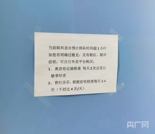 记者注意到,由于近期前来就诊的患者数量增多,且症状颇为相似,北京同仁医院急诊眼科诊室的门上已张贴了关于过敏性结膜炎的注意事项、用药提示以及用药推荐等相关信息。