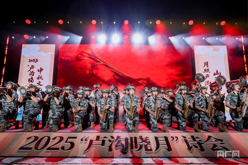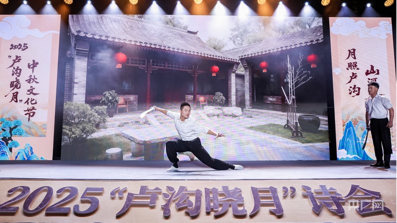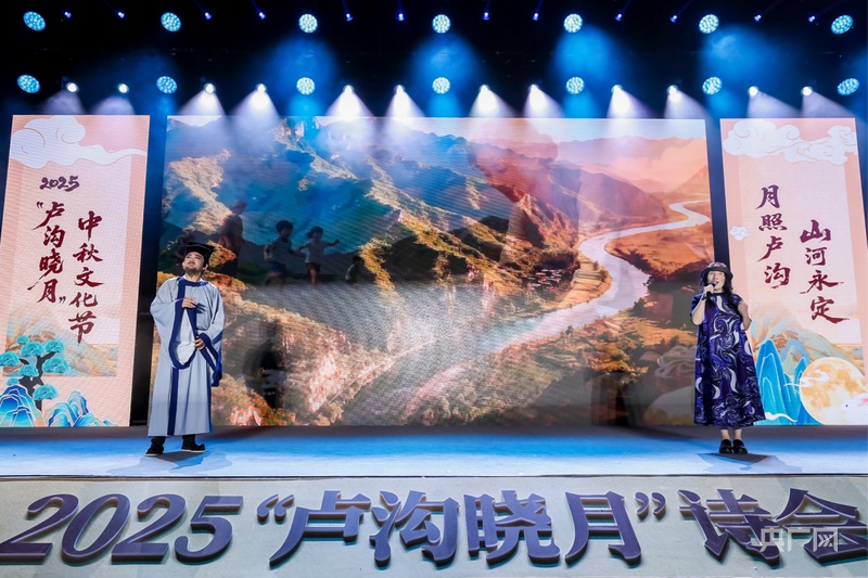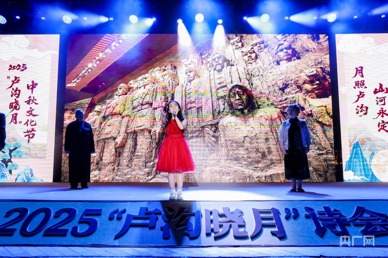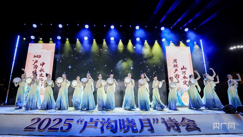 诗会以“月映卢沟 桥畔传诗”“月萦烽火 丰碑永铸”“月满家园 灯火相传”三个篇章展开。在第一篇章“月映卢沟 桥畔传诗”,中央广播电视总台新闻中心《新闻纵横》节目主播、主任播音员苏扬深情诵读《水调歌头·明月几时有》,水墨风背景映衬下,经典词句尽显中秋月色之美;舞蹈《卢沟晓月》,将卢沟桥的意境与舞蹈完美融合,展现了跨越千年的浪漫与诗意。