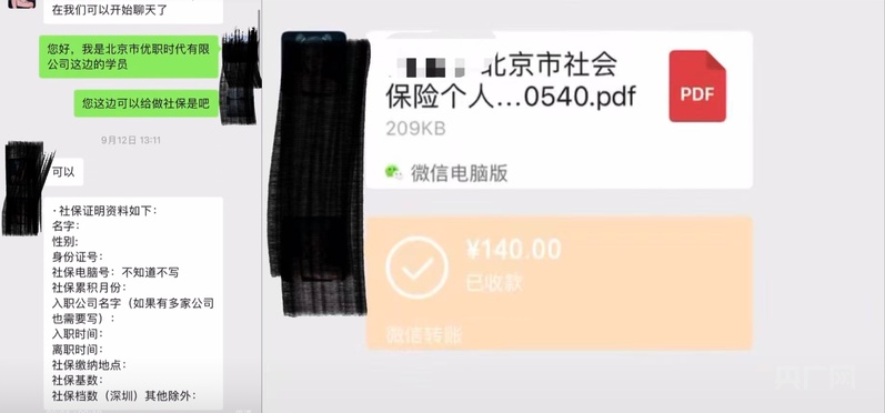 刘微说:“‘授课老师’向我们推了他们的‘合作方’,说可以伪造社保记录方便我找工作。”交了140元后,老师推荐的“合作方”向她发送了一份名为《北京市社会保险个人参保证明》的PDF文件,并称入职时向公司提交这份《证明》就可以,“一般来说都会通过,很多‘学员’都是通过这种方法入职的。”
