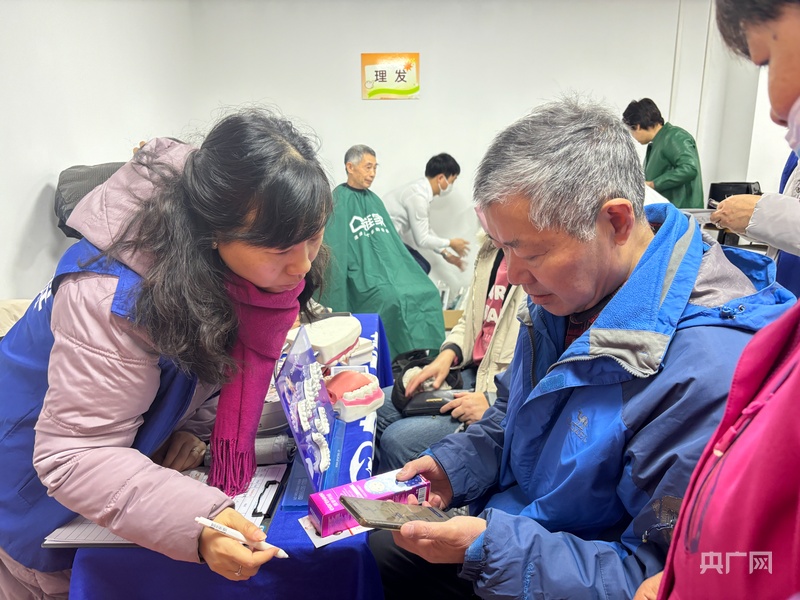 活动现场共划分三大区域,汇聚10余家企业、30余名志愿者到场服务。在健康区内,快速便捷的检测最受老年居民青睐。来自辖区医疗机构的志愿者为居民量血压、测血糖;医生关注老年人牙齿口腔健康,在详细检查老人牙齿状况后,提出对应的医疗建议。