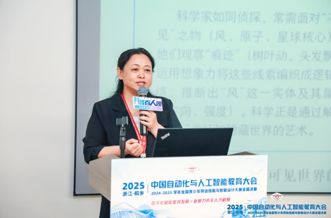 北京市海淀区永泰小学科学主任张中华的报告主题是“解码AI心智:从计算基石到想象之翼”。张中华从哲学视角探讨想象,阐述其作为人类创造力的源泉;通过追溯从算筹到电子计算机的发展历程,揭示让机器进行计算所经历的漫长探索。她还介绍了人工智能的兴起,揭示了AI的本质为“机器获得自主学习与深度学习的能力”,并通过具体案例展示机器如何实现自我学习,最后介绍了人工智能在日常生活中的广泛应用。