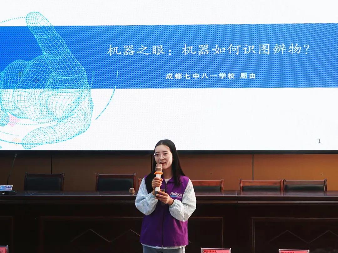 刘妍在现场作报告,聚焦“简单AI场景”与课堂应用,让同学们直观地认识到AI赋能全球、驱动社会发展的作用。她进一步解析AI核心价值——优化效率、助力创新、提供个性化服务,认为AI是延伸人类能力的工具,并非替代者,展望未来需全社会共同引导其健康发展。