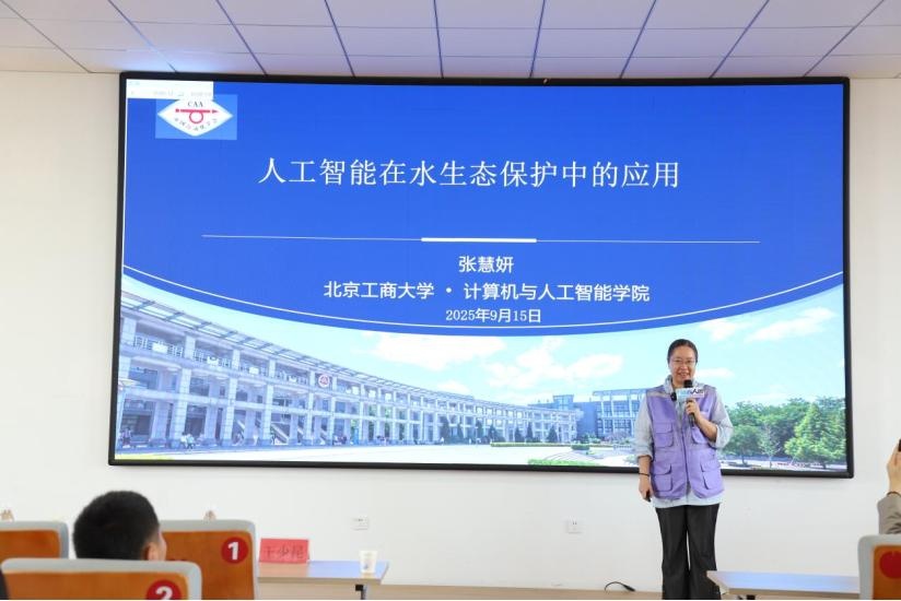 张慧妍在报告中聚焦人工智能在水生态保护中的应用,通过生动的案例和详实的数据,展示了人工智能技术在环境保护领域的巨大潜力,激发师生们对科技改善生活的美好憧憬。报告围绕水生态的监测与治理问题,介绍显微镜观测图像与视频处理用到的多种AI智能识别与建模算法以及设备的研发,从水生态领域的应用需求与问题出发,探究人工智能技术为水生态研究带来的机遇与挑战。