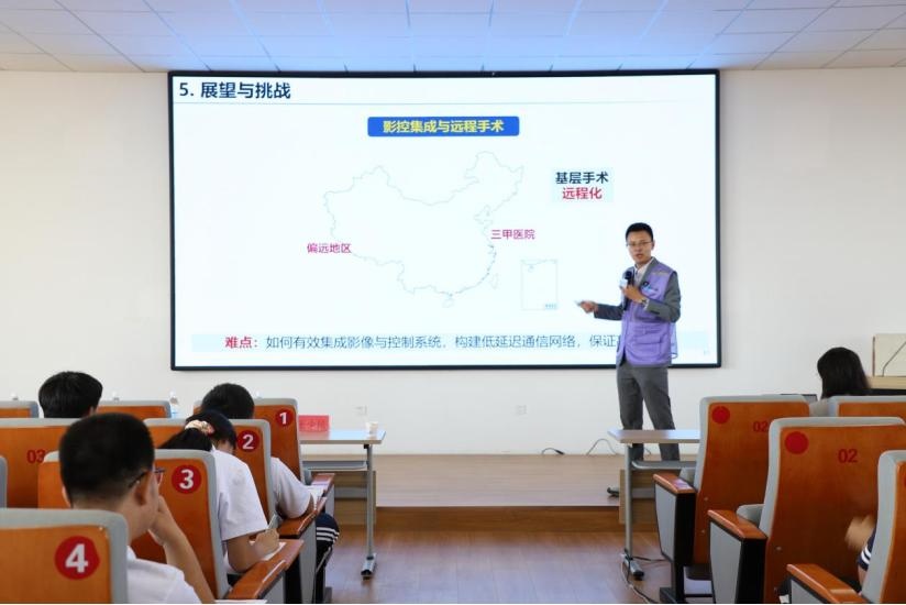 在科普报告环节,桂美将以“医生的‘科技队友’是谁?共探手术机器人的发展故事”为题,深入浅出地介绍了手术机器人的发展历程、技术原理及应用前景,让师生们对这一前沿科技有了更直观的认识。报告围绕手术机器人提升手术精准度、降低操作难度的核心价值,按细分领域阐述腹腔镜手术机器人的技术成熟度与临床普及情况,探讨经自然腔道手术机器人在减创伤、促康复方面的探索等。报告最后对手术机器人的研究进行了展望,使同学们大开眼界,对手术机器人有了进一步的认识。