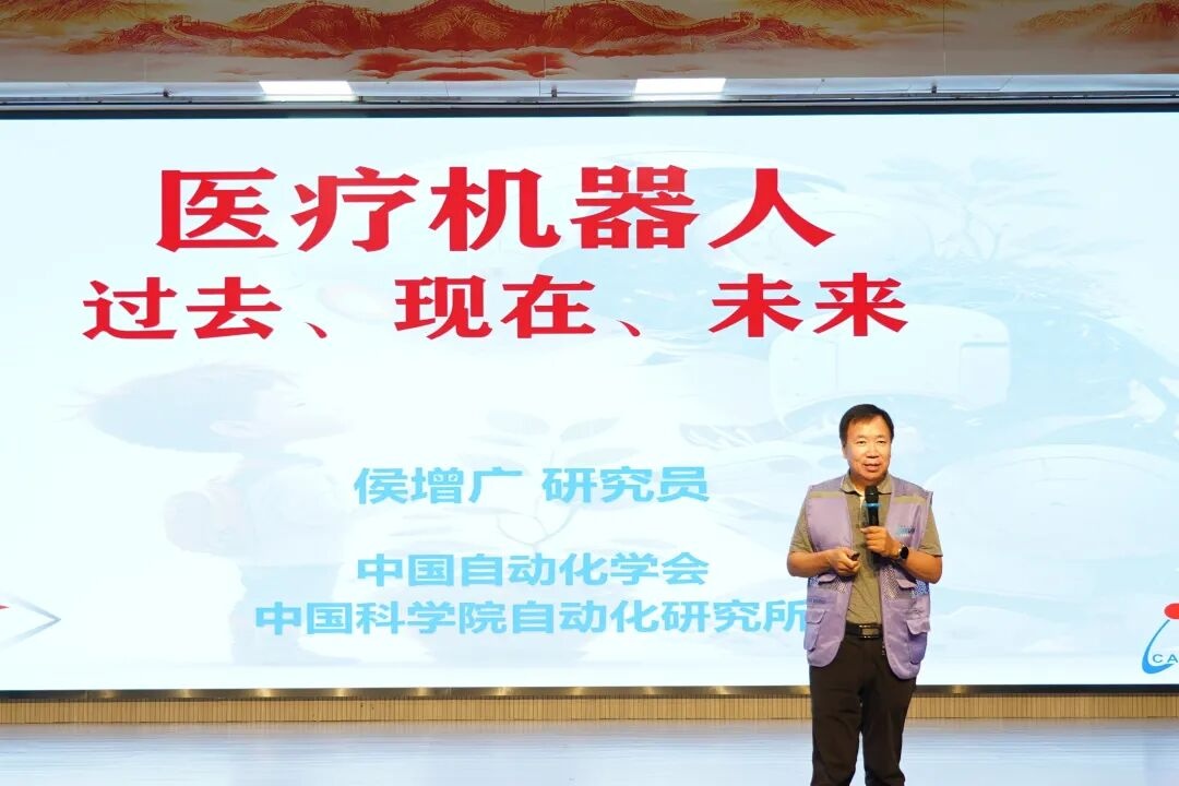 在报告环节,侯增广以“医疗机器人的过去、现在、将来”为主题开展科普报告,以“何为幸福?愿不愿去医院?未来是否想成为医生?”这三个饶有趣味的问题开场,巧妙引导学生关注自身对疼痛触觉的体验。随后,在讲解医疗健康机器人时,通过展示实际应用案例和智能模型,让学生们直观了解到自动化机器人系统如何在手术操作、康复护理等医疗场景中发挥关键作用。