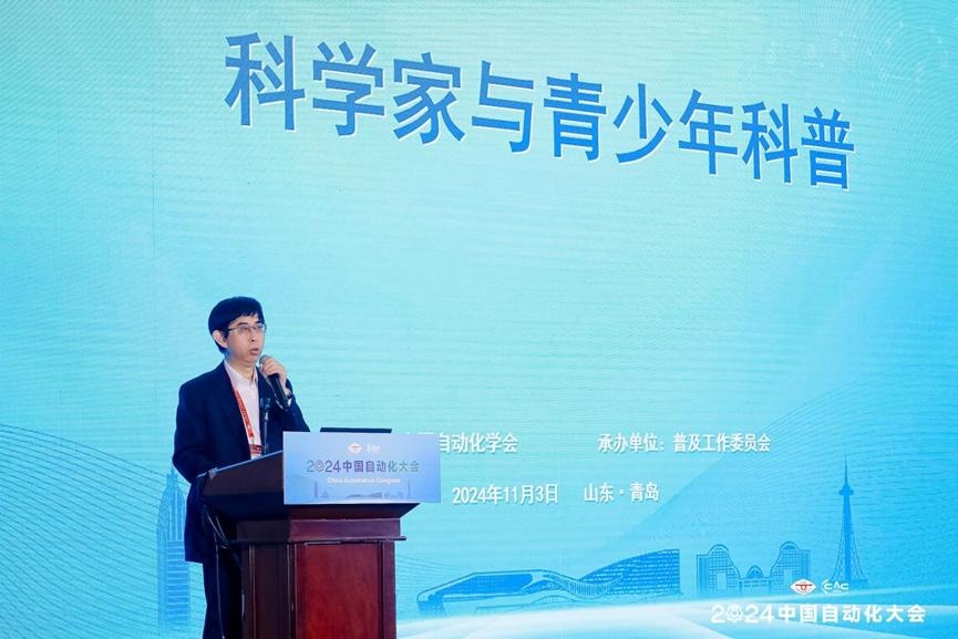 在2024中国自动化大会平行会议“科学家与青少年科普”会议上,中国自动化学会副理事长、青岛科技大学副校长李少远对参与公益活动的专家们致以最深切的谢意,同时表示自己会继续支持和参与相关的活动。(来源:中国自动化学会)