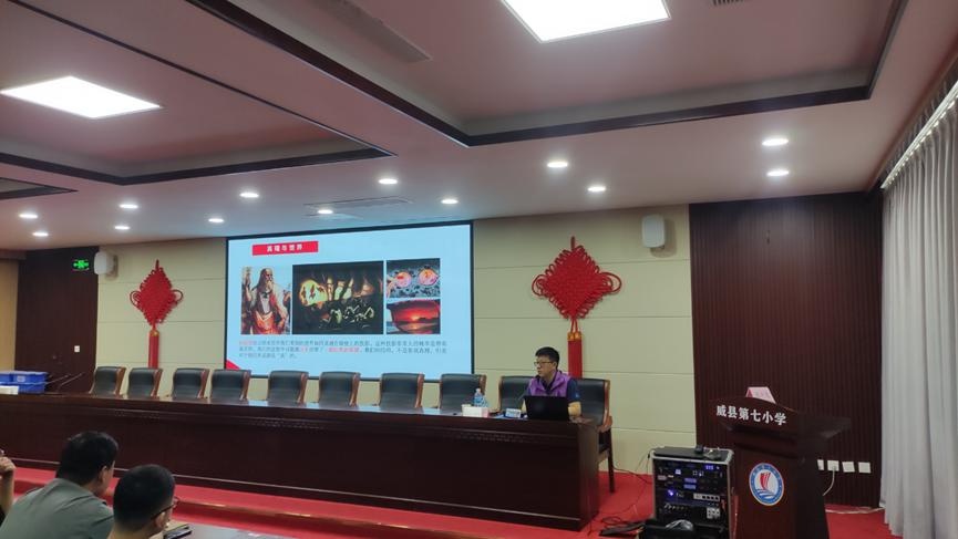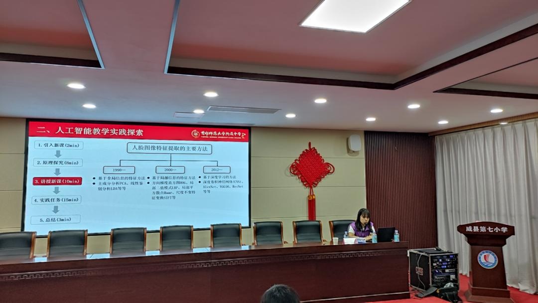 首都师范大学附属中学老师贾媛媛在威县第七小学分别为老师和学生作了两场讲座。在面向老师的讲座中,她以《人工智能教学实践:探索和思考》为题,用丰富的案例引发老师对于人工智能教学相关技术应用的思考,提出应注重让学生体验人工智能应用,讲解这些应用背后的实现流程和经典的算法知识,以提升核心素养。