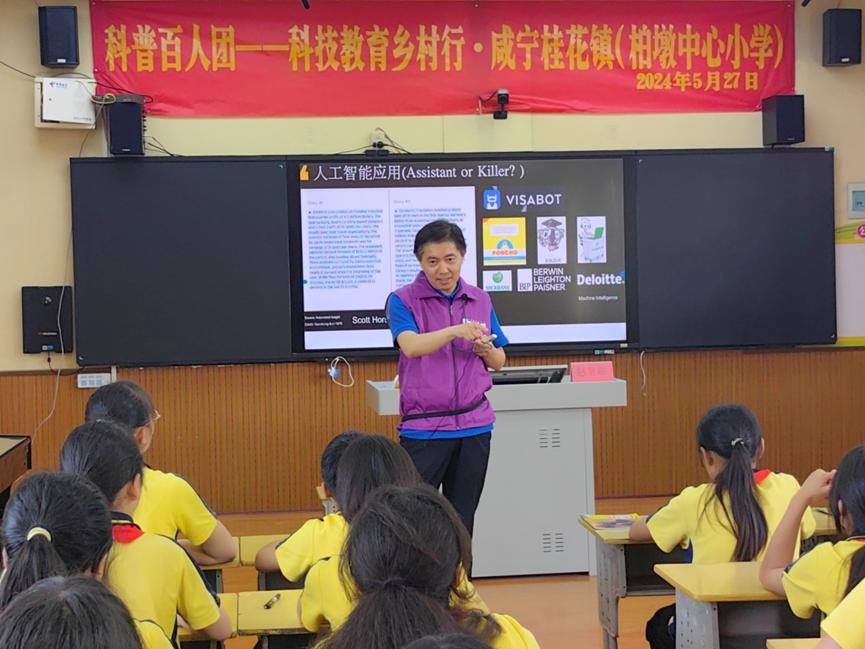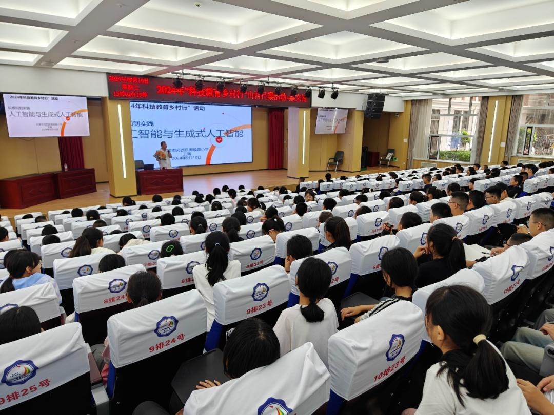 在湖北省咸宁市咸安区桂花镇的三所中小学校,复旦大学副教授赵卫东给孩子们生动讲解了《人工智能的前沿技术应用》,带孩子们了解AI背后的逻辑和原理;中国传媒大学副教授靳聪带孩子们领略《AIGC课堂实践——奇妙的文生音乐之旅》,人工智能生成技术在音乐领域的前沿应用让孩子们大开眼界;华中师范大学第一附属中学信息技术高级教师查成林给同学们带来《从有限计算到无穷想象》的思维启蒙课,他为同学们勾勒出人工智能技术迅速发展的宏伟图景,带孩子们畅想“硅基生物”离我们还有多远。