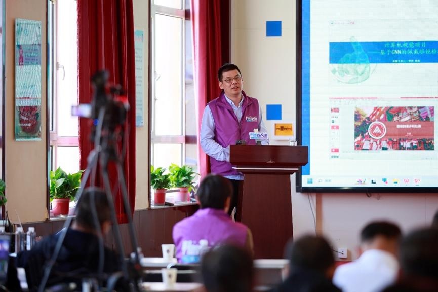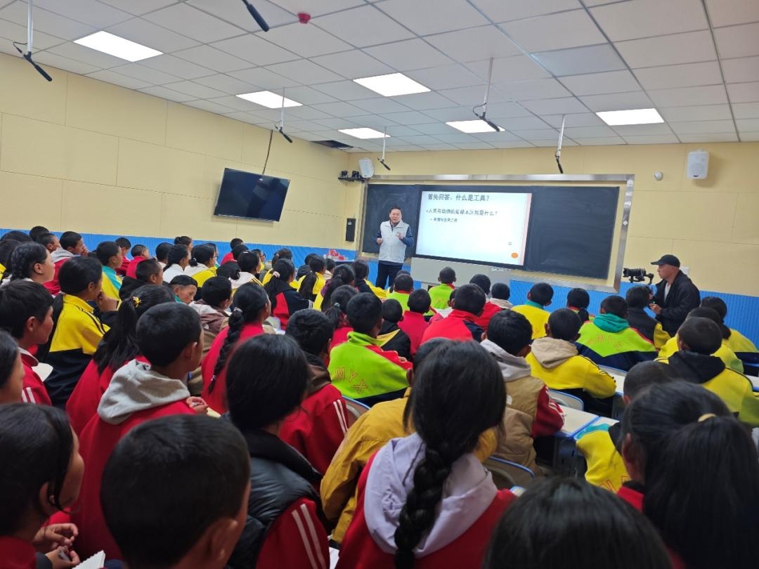 在西藏自治区那曲市尼玛县的中学,CAA普及工作委员会副主任委员、CAA智慧教育专业委员会秘书长、中国科学院自动化研究所副研究员刘希未给师生们带来了题为《人工智能是什么》的讲座。他从“工具”这个主题开始和同学们进行讨论,从而引出人类与动物的最根本区别——有意识地制造和使用工具,进而梳理了工具的进化历程,并带领着同学们推导出结论:人工智能就是工具智能,也就是机器智能。来自拉萨市实验小学的援藏信息科技教师王军为尼玛县第一小学的同学们带来一堂充满趣味的人工智能启蒙课,他用生活中的简单例子引导孩子们理解“人工智能”这个词,为同学们生动地解释了AI如何通过学习大量的数据和经验,模仿人类的思考与决策过程。