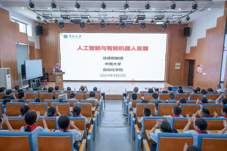 9月,在湖南省常德市武陵区的五所中小学校,中国自动化学会智慧教育专委会委员,中南大学自动化学院副院长、博士生导师徐德刚探讨了人工智能与机器人的前沿关键技术、产业发展趋势及创新应用。深圳清华大学研究院下一代互联网研发中心副研究员龚超探讨了生成式人工智能如何改变工作与教育的范式,并解读“人工智能+”如何通过跨领域的创新实现更有效的教育实践。中南大学自动化学院副教授、国家精品课程《人工智能》主讲教师陈白帆生动讲解了人工智能的历史与发展、基础原理、伦理思考以及未来展望;长沙市周南中学信息技术教师、湖南省人工智能学会副秘书长彭艳芳介绍中小学人工智能课程实施的方法,讲解如何开展主题设计项目制探究式课堂教学,还分享了教师自我成长的方法与策略。