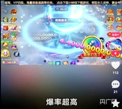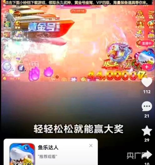 记者在调查中发现,这类捕鱼游戏在短视频平台、直播渠道的宣传推广内容,多数以“不充值也能玩”“捕鱼换实物、换新车”“百万倍暴击、一炮上亿金币”为核心宣传点,短视频平台的直播画面经常出现“高爆率”“捕大鱼”等胜利画面,有游戏主播还宣称“不需要充值也能玩爽”。
