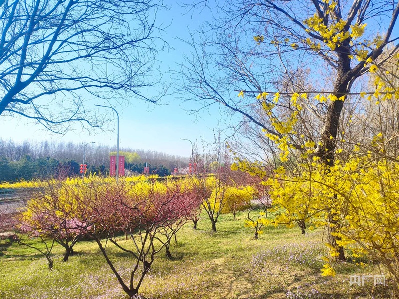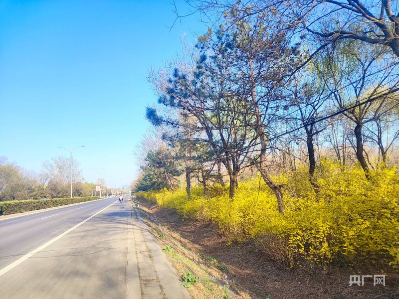 新平蓟路金色大道两侧景观林带宽达百米,栽植金叶榆、金叶国槐等金色系乔木,搭配连翘、迎春花等花灌木。早春时节,迎春花金花串串、明艳动人,与周边淡淡绿意相互映衬,形成“金辉漫路、流光溢彩”的独特景观。