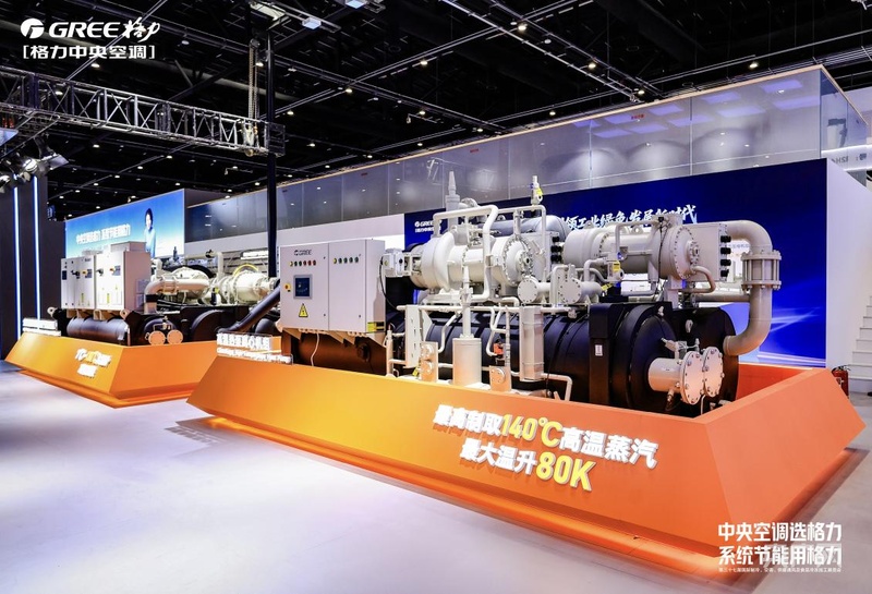 在中央空调展区,格力聚焦工业、商业与家庭三大应用场景,展出了一系列具有国际领先水平的产品。其中,工业高温热泵系列成为全场焦点,包含余热回收高温热泵、冷热联供复叠式螺杆机组及水蒸气压缩机,可稳定输出60℃至200℃的高温热水与工业蒸汽,全面覆盖油田、钢铁、食品加工、酿酒、纺织、造纸、化工、医药、汽车制造等工业领域。该系列产品以清洁电能替代传统燃煤燃气锅炉,大幅降低工业用热的碳排放与运行成本。