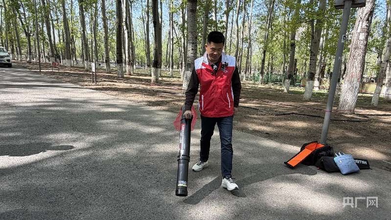 工作人员在操作杨柳飞絮吸收机(央广网发 北京市园林绿化局供图)