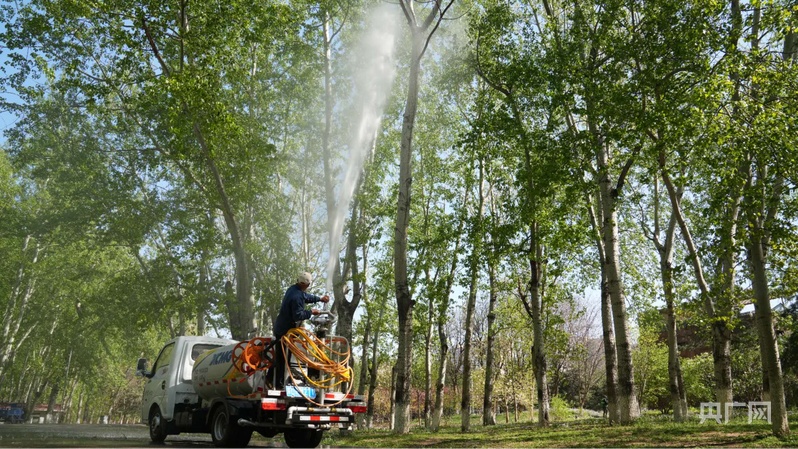工作人员在喷凝絮剂(央广网发 北京市园林绿化局供图)