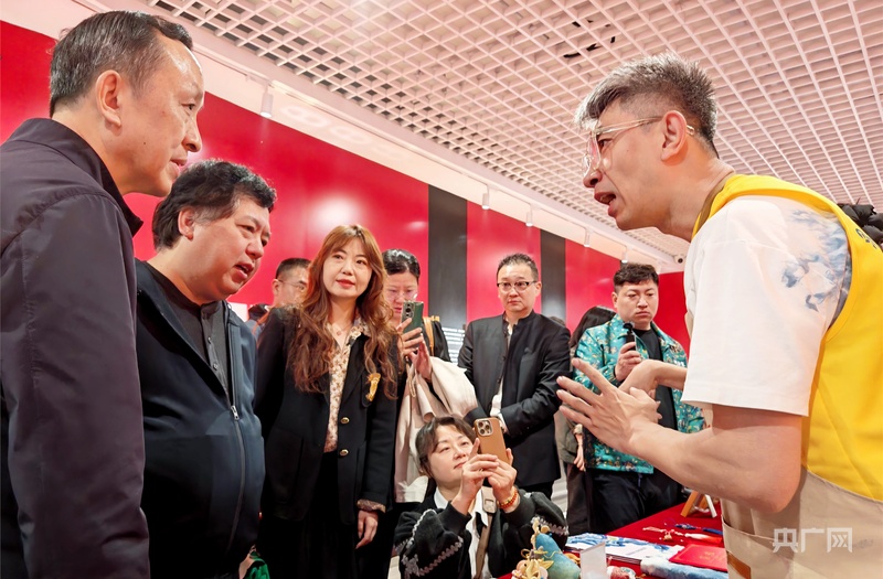 王卫军(右一)介绍草木染扎染工艺(央广网记者 庞婷 摄)