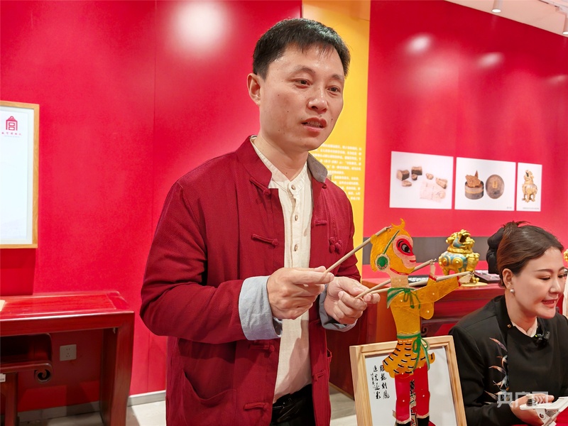 张佐飞(左)介绍皮影雕刻技艺(央广网记者 庞婷 摄)