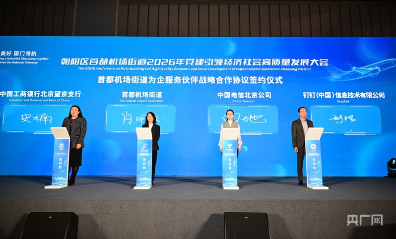 大会举行战略合作签约仪式,首都机场街道与中国电信北京公司、中国工商银行北京望京支行、钉钉(中国)信息技术有限公司签约,成立“国门”为企服务伙伴联盟,围绕科技通讯、金融支持、数字化协同等领域,为辖区企业提供集成化、专业化、全链条服务支撑。