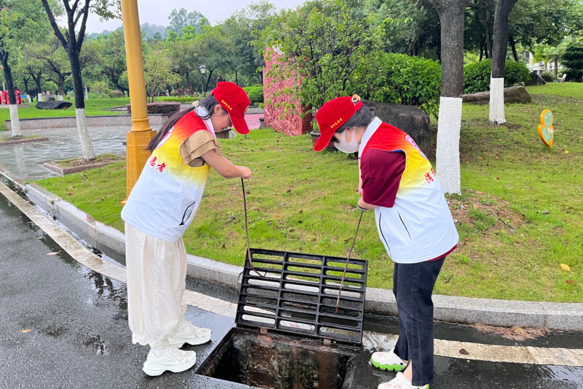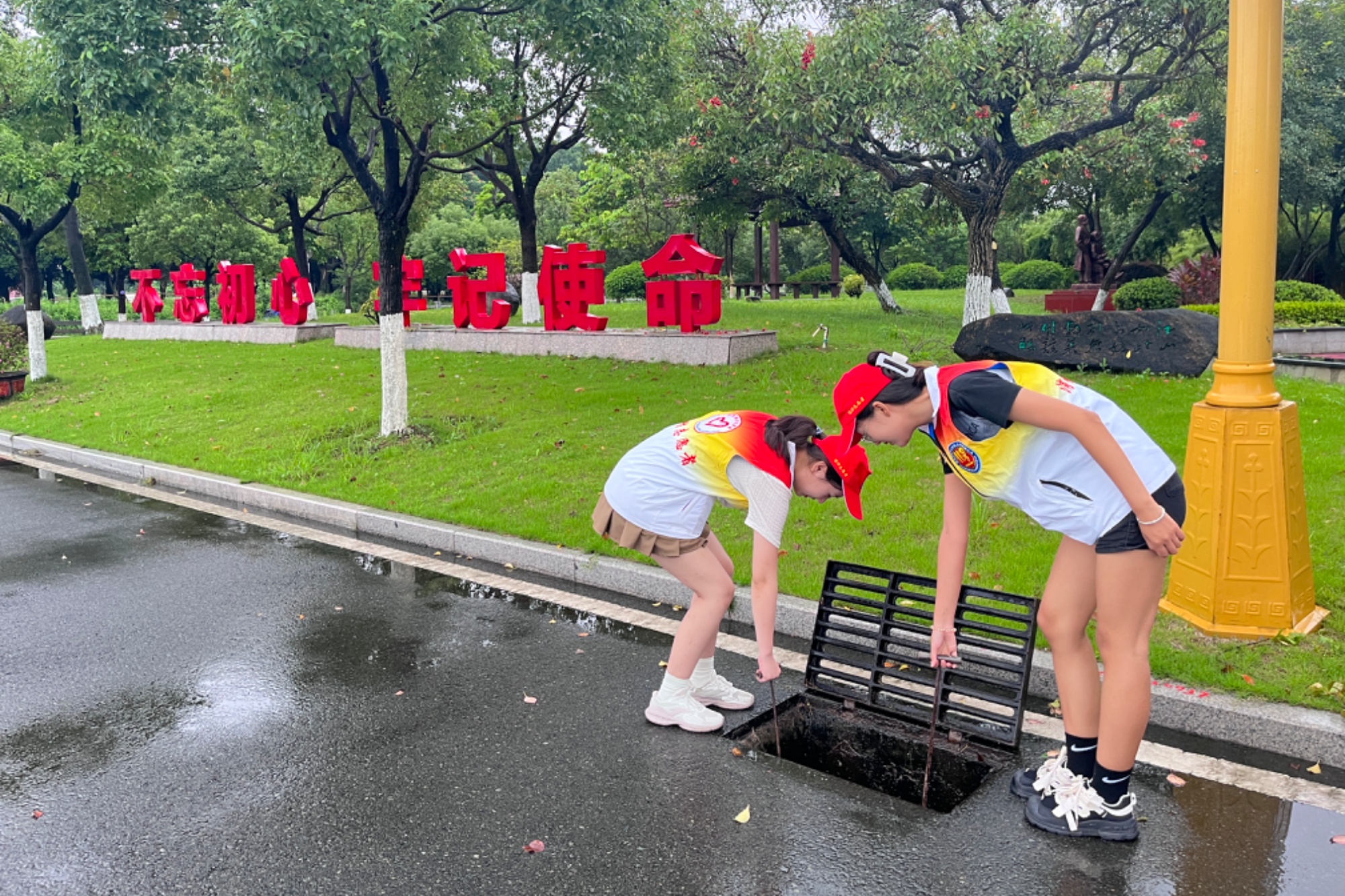 校园志愿者提前检查排水系统,确保校园安全(漳州卫生职业学院供图)