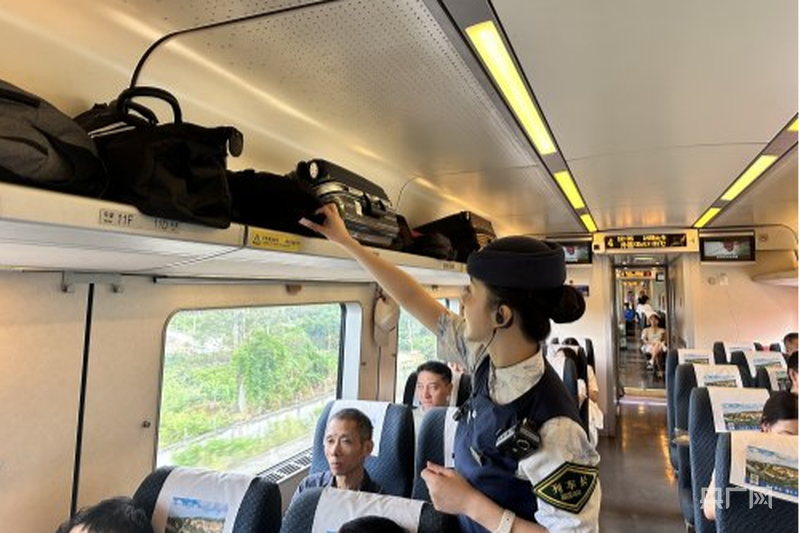 郁叶雯在为旅客归置好行李(央广网发 福州客运段供图)