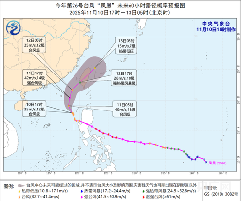 央广网福州11月10日消息(记者龚雯)据中国气象台官网消息,今年第26号台风“凤凰”于11月10日17时距离台湾鹅銮鼻南偏西方向约500公里,强度为台风级(12级,约126公里/小时),预计将以每小时10-15公里的速度向北偏西方向移动,强度逐渐增强。