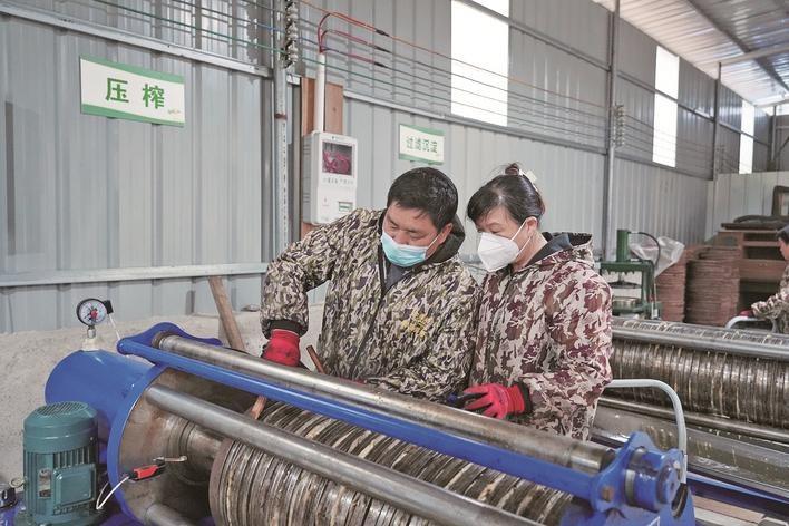 连日来,在沙县区南阳乡上官家庭林场榨油坊内,弥漫着浓郁的油香。工人们从炒籽、打粉到蒸榨、过滤,每一道工序都一丝不苟。目前,该林场种植了300亩油茶,去年共收获油茶青果10万斤,可获益30万元。图为工人在装茶饼。(沙县记者站 吴伟 摄)