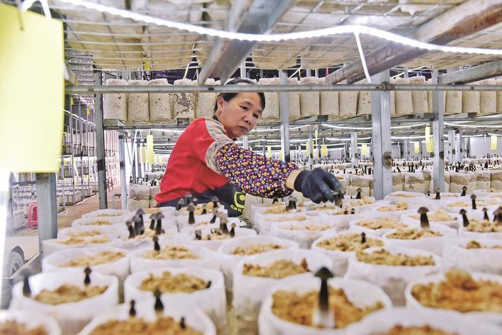 1月20日,在尤溪县天草菌物种业有限公司种植大棚里,工人们分工协作,忙着采摘、切削黑皮鸡枞,将滑菇称重打包。公司于2019年4月落户西滨镇七里村,专注于菌种引种试验、菌种与菌袋的生产供应,并种植黑木耳、秀珍菇、滑菇、黑皮鸡枞和龙爪菇5个品种。目前,菌菇每日总产量可达5000至1万袋。(尤溪记者站 肖丹 通讯员 兰景赟 摄影报道)