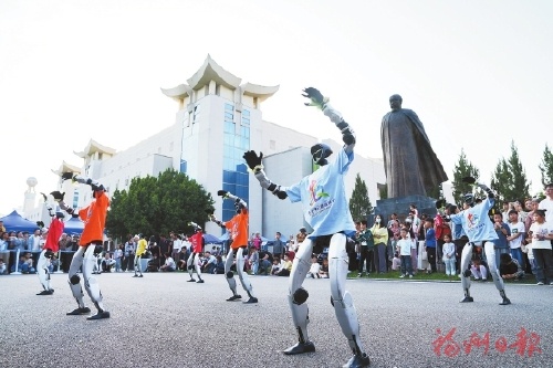 昨日(4月25日),在福建博物院广场,随着音乐响起,10台银白色机器人整齐列队,跟随节拍精准卡点、灵活摆臂,引得围观市民连连惊叹,不少人举起手机记录这一充满未来感的瞬间。