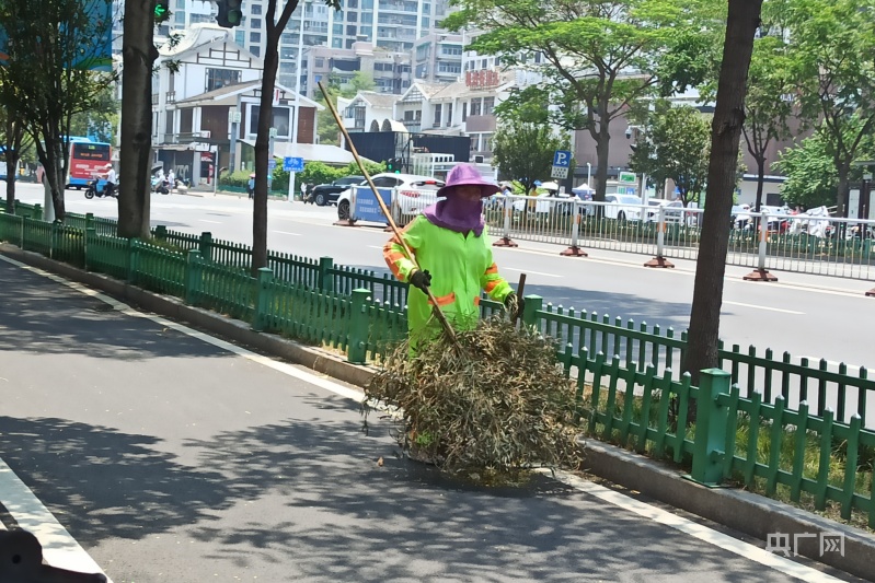 26日正午,环卫工人顶着烈日清扫街道(央广网记者 罗晓英 摄)