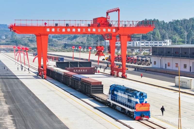 装载货物的列车从永安闽中公铁联运物流基地铁路港驶出(央广网发 张海根 摄)